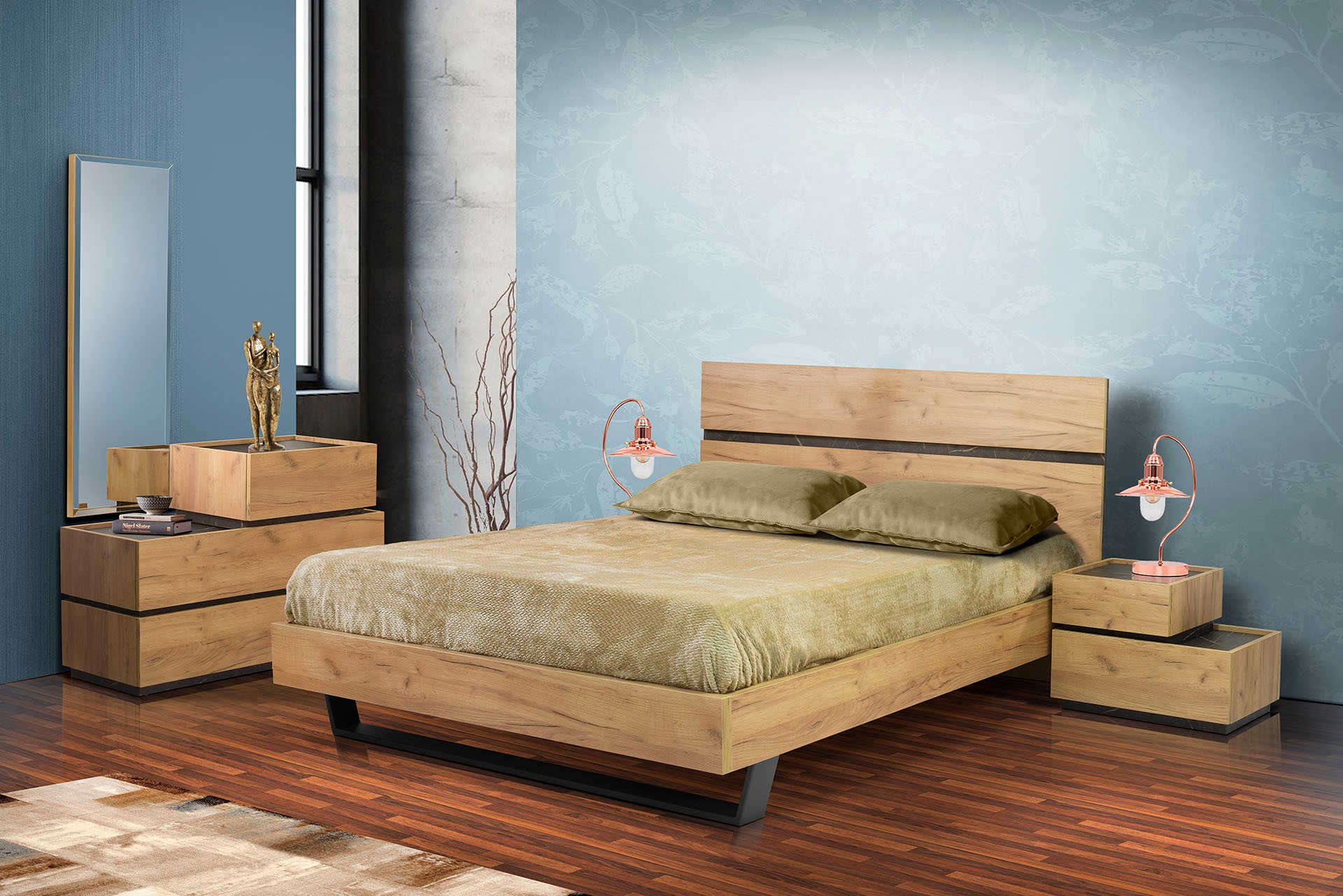 Το σετ περιλαμβάνει δύο κομοδίνα , υπέρδιπλο κρεβάτι , τουαλέτα με καθρέπτη και τελάρο. Κατασκευασμένη από υψηλής ποιότητας μοριοσανίδα – ελληνικής παραγωγής- για αντοχή και διάρκεια στον χρόνο. Μια μοντέρνα επιλογή για την κρεβατοκάμαρα σας η οποία παράγεται σε χρώμα και διάσταση της επιλογής σας. Μπορείτε να επιλέξετε διχρωμία ή μονοχρωμία, όπως επίσης εάν θα διαθέτει αποθηκευτικό χώρο ή μεταλλικά παράλληλα πόδια! Ιδιαίτερη λεπτομέρεια , οι αποσπώμενες μαξιλάρες που τοποθετούνται στο κεφαλάρι αλλά είναι και αποσπώμενες ώστε να τις χρησιμοποιείτε οποιαδήποτε στιγμή θέλετε (+225€). Δυνατότητα αλλαγής διάστασης κατόπιν συνεννόησης!